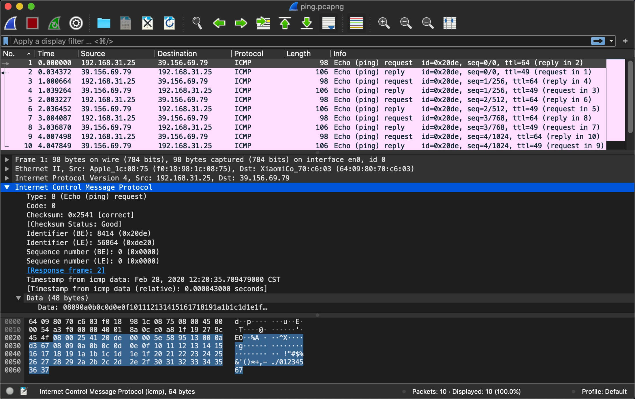 TCP/IP 学习笔记 | ICMP:因特网控制报文协议VINCENT STUDIO2020-02-28 Tech TCP/IP切记:少就是多,慢就是快。ICMP (Internet Control Message Protocol) 因特网控制报文协议用于在IP主机、路由器之间传递控制消息。 控制消息是指网络通不通、主机是否可达、路由是否可用等网络本身的消息。抓包我们 ping 一下百度,瞅瞅 ICMP 报文的长啥样。可以看出,ICMP 是封在 IP 数据报里的,结构比较简单数据结构