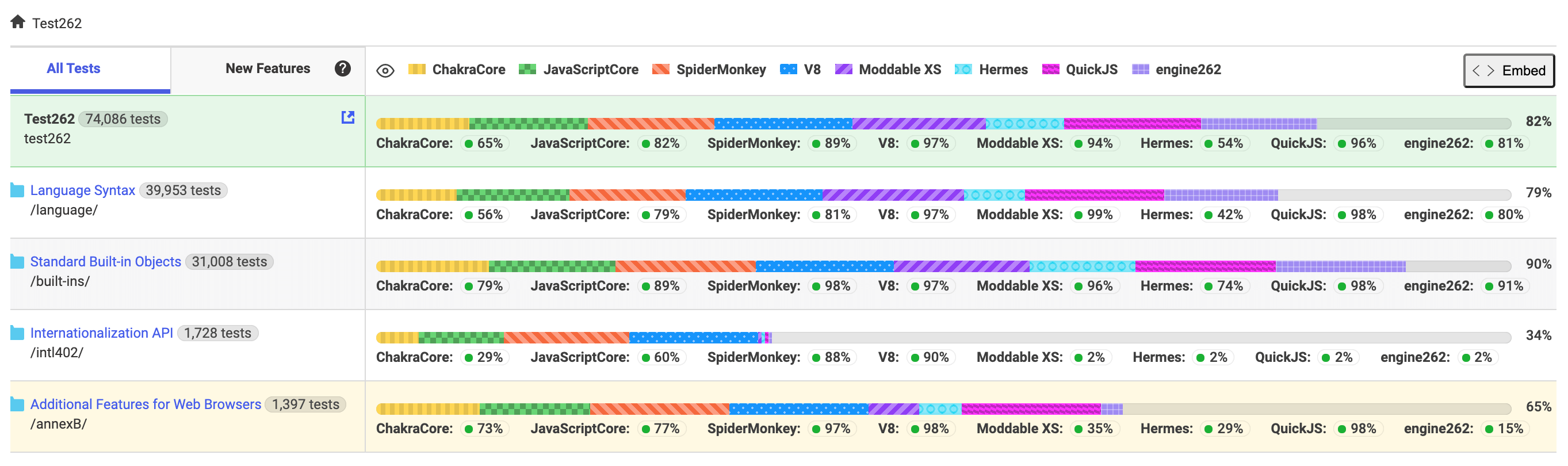 最近,这位大佬的新作品 QuickJs 又火了,这个用 C89 写的只有几万行代码的 JS 引擎,居然通过了 Test262 96% 的测试,仅次于 V8 的 97%,ChakraCore (Edge) 只有 65%。新特性的通过率高达 89%, 仅次于 V8 的 90%,ChakraCore (又躺枪) 只有 16%。