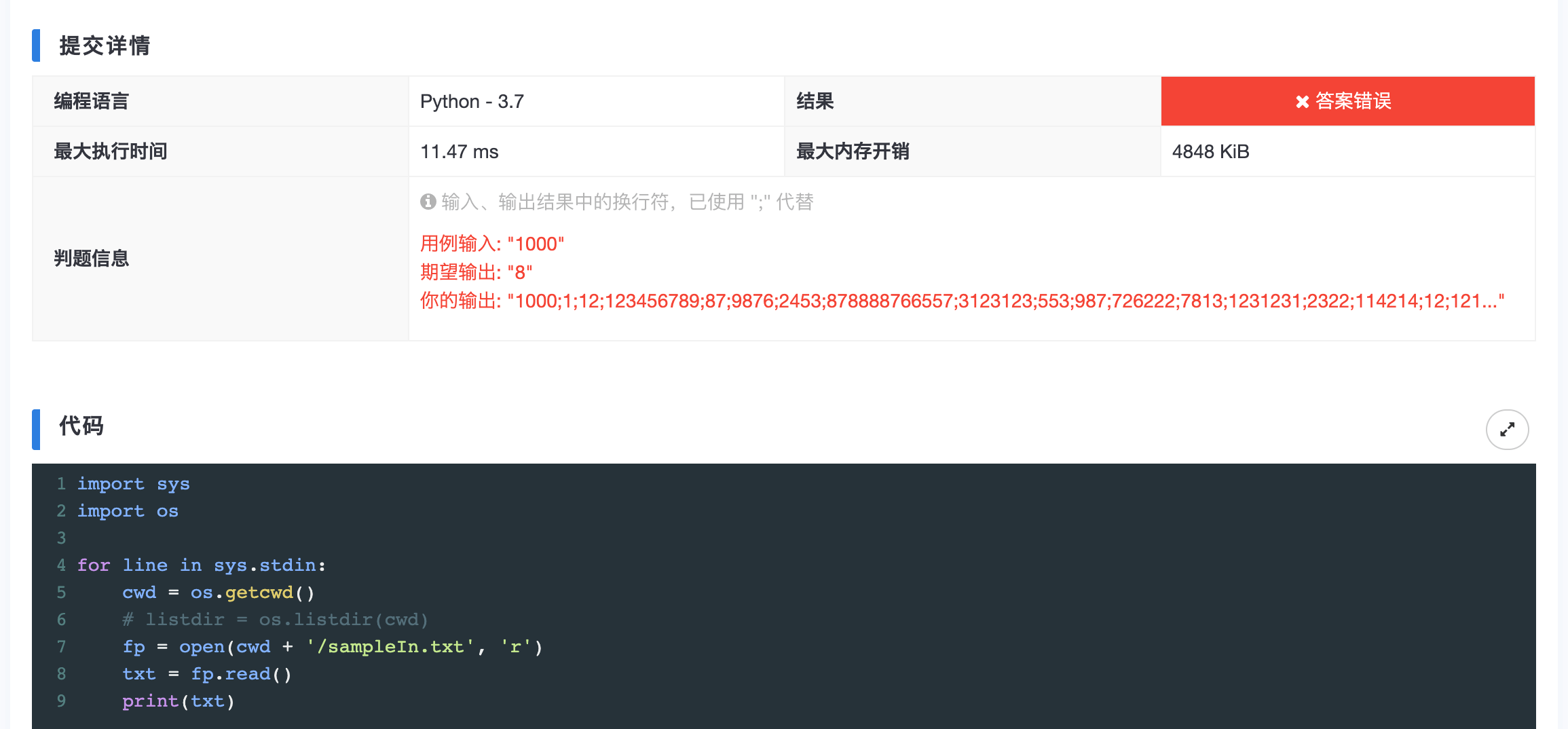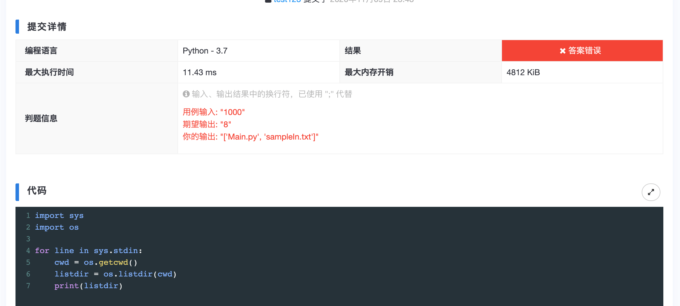 我们可以看到用户直接就能拉到 os 模块(我尝试过 LeetCode 也是如此),那么后面可以做的事情就多了。我发现测试用例直接在当前执行路径下的 sampleIn.txt 文件中,打印一下试试: