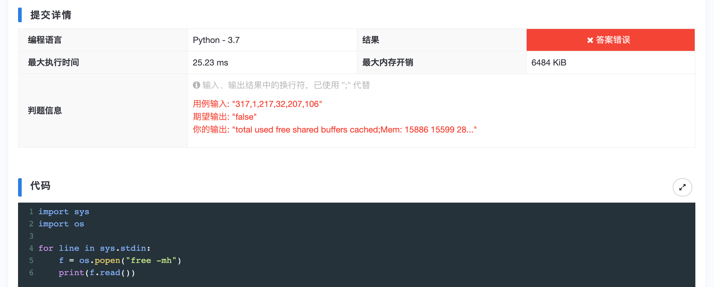 经过测试,LeetCode 和 MiOJ 都能通过 os.popen 执行 shell,但是权限只读。我想既然 LeetCode 都这么干了,那应该也算业界公认了。不过 MiOJ 的测试用例直接就放在了容器内部,这样一来拿到测试用例的用户就能够直接通过枚举刷题,也很不公平了。