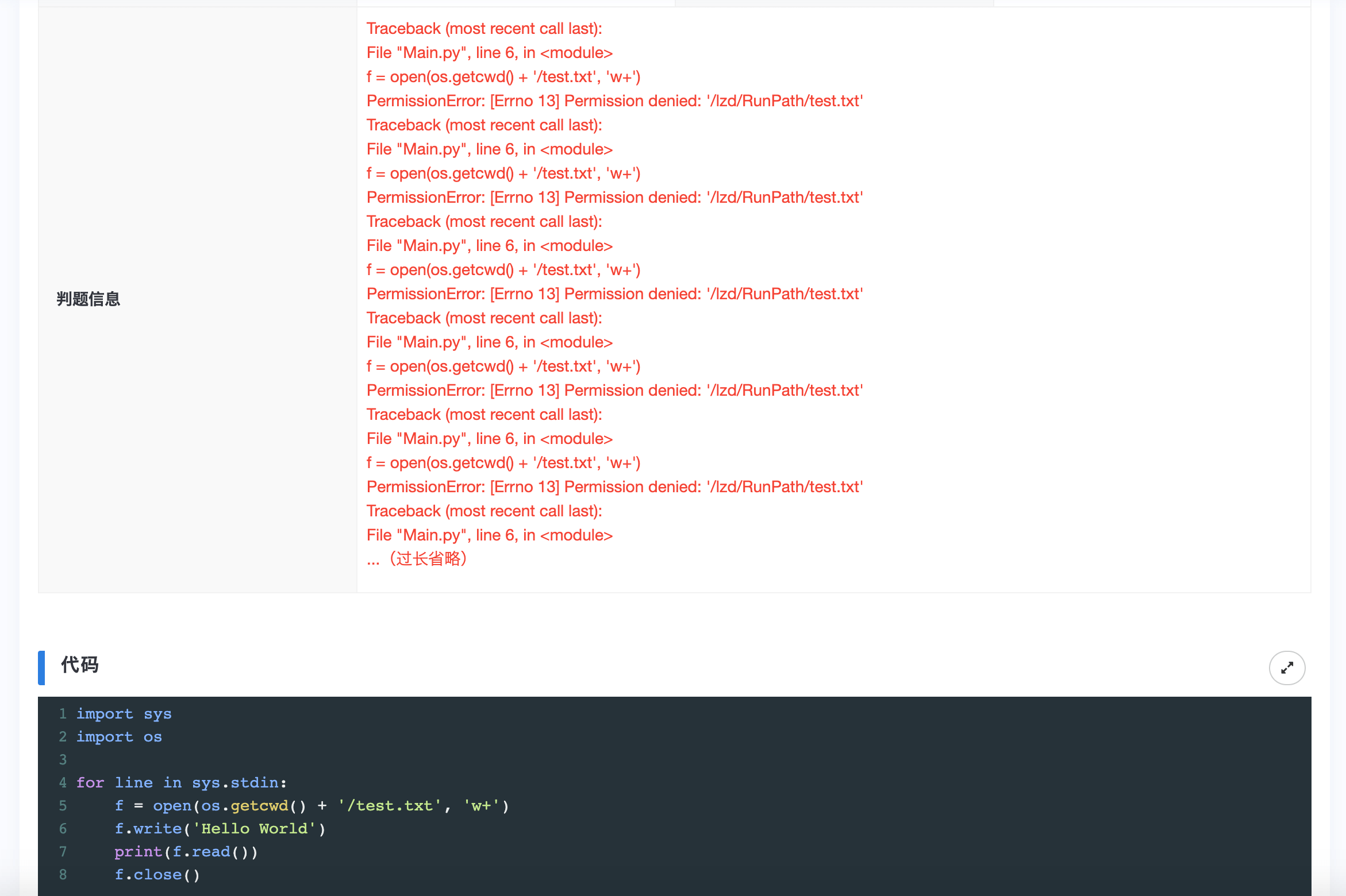 OJ 这一类用户拥有代码上传权限的平台应该很容易会产生上传漏洞,特别是像 Python 一类的脚本语言,很容易做到沙箱逃逸。经过一番尝试,发现的确大部分 OJ 平台都能拿到执行权限。以 MiOJ 为例:
